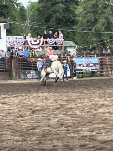 In addition to all the adult events, there are some “Junior” versions of these events for teens. Bareback, Steer Riding, Ranch Broncs and Saddle Broncs, Bull Riding. Ranch bronc riders use a saddle with a horn and the cowboy or girl holds on with two hands. The saddle bronc riders have a specially designed saddle with no horn and grip a rein with one hand.