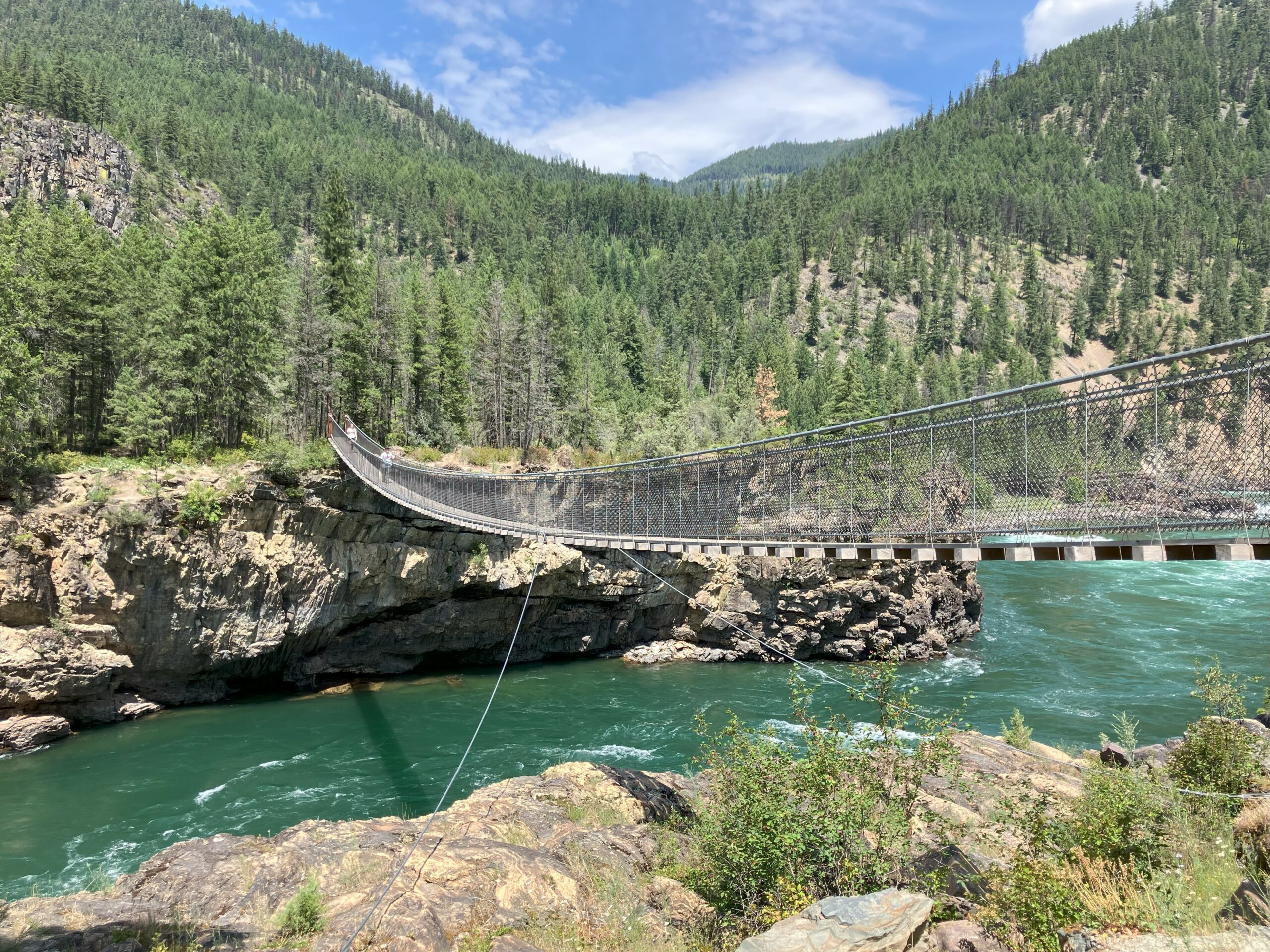 A suspension bridge crosses the powerful Kootenai River. A wiggling, wobbling, chained-together beams with planks-on-top walkway. There is a sign: No more than 5 people on the bridge at a time.