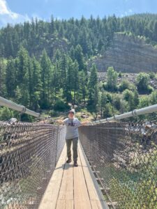 Surrounded by tan rocky slopes, dotted with pines, the fresh air calmed my spirit. Deep aquamarine water bubbled and churned upstream. Across from me the riverbank climbed steeply to the trail we had followed to get to the suspension bridge.